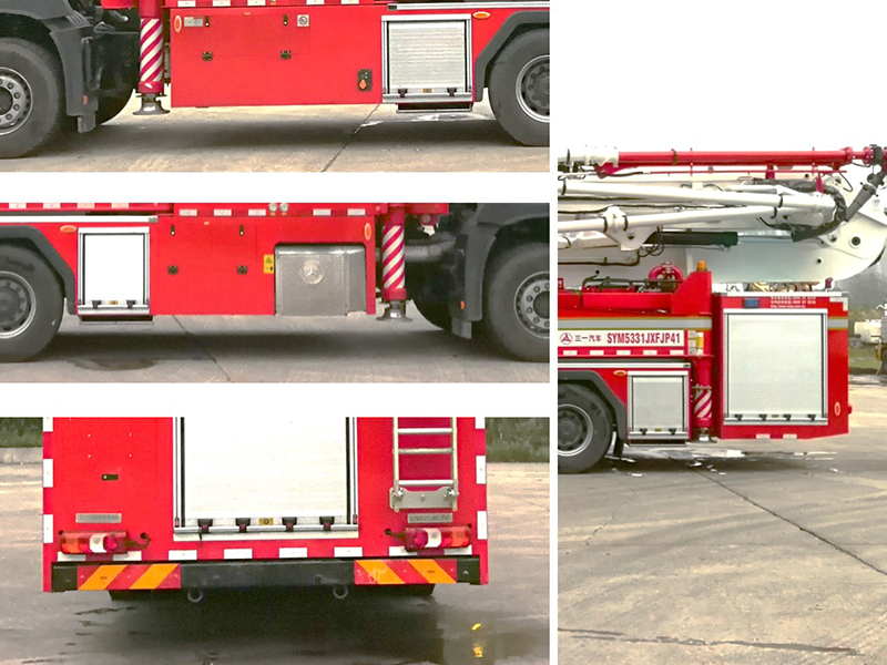 整車備注:罐體總?cè)莘e:3.420立方米,水罐容積:1.900立方米,水罐尺寸:1440×1730×790 mm,泡沫液罐容積:1.520立方米,泡沫液罐尺寸:1150×1730×790 mm。整體式側(cè)防護(hù)結(jié)構(gòu),后防護(hù)裝置材料:Q345B,截面尺寸:140×60mm,后防護(hù)離地高度:490 mm,與車輛連接方式:螺栓連接,后伸:1030 mm。ABS生產(chǎn)企業(yè)為WABCO,型號(hào)為EB5006。主要專用裝置有臂架、消防泵、消防炮。
