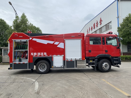 JDF5190GXFPM80/G6型泡沫消防車采用重汽汕德卡ZZ5206N471GF5底盤改裝而成。整車由消防員乘員室和車身兩大部分組成,乘員室為原裝雙排,可乘坐2+4人,該車為外露罐結(jié)構(gòu),車身前部為器材箱,中部為水罐,后部為泵房。