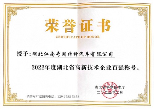 湖北江南獲得由湖北省科學技術廳、湖北省財政廳、國家稅務總局湖北省稅務局機關批準。由湖北省科學技術廳頒發(fā)的“2022年度湖北省高新技術企業(yè)百強稱號”榮譽證